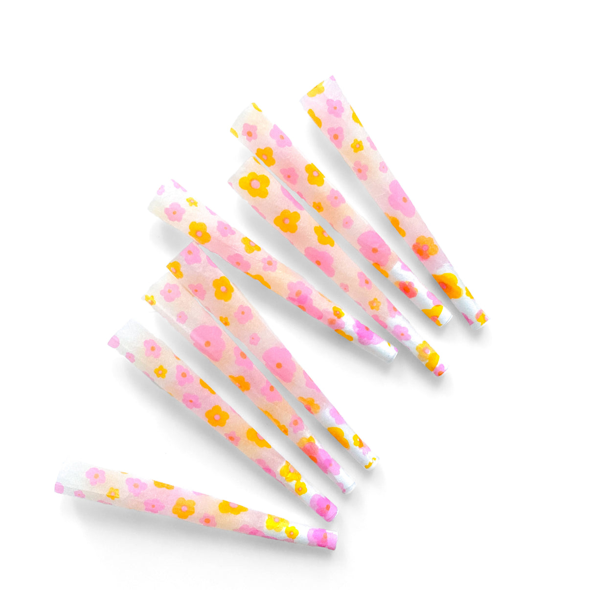 Inspired by the softness of watercolor paintings, these whimsical cones are adorned with light pink and orange blooms. Printed with plant-based inks. Each pack consists of 8 Lucky Cones and a tamping tool for packing.