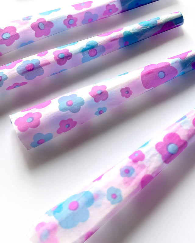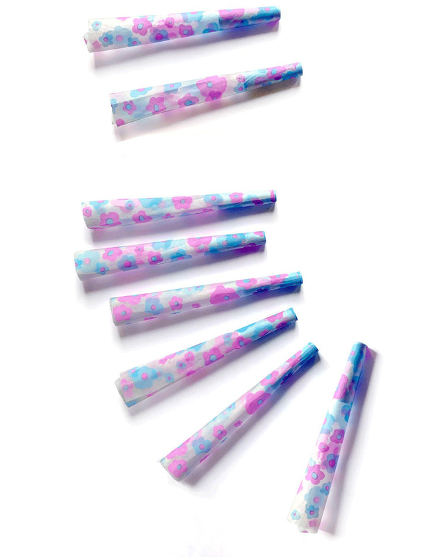 Set of 8 blue and purple watercolor floral patterned pre-rolled cones. These rice paper cones are hand-rolled and are printed with plant-based inks. Each pack comes with 8 patterned cones.